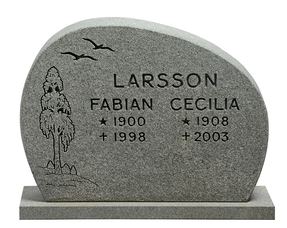 Låg bred gravsten GK1008-EF med måtten 55 x 70 cm i mörkgrå granit, bränd framsida, mattslipade kanter, stil 41, text och dekor djupblästrade