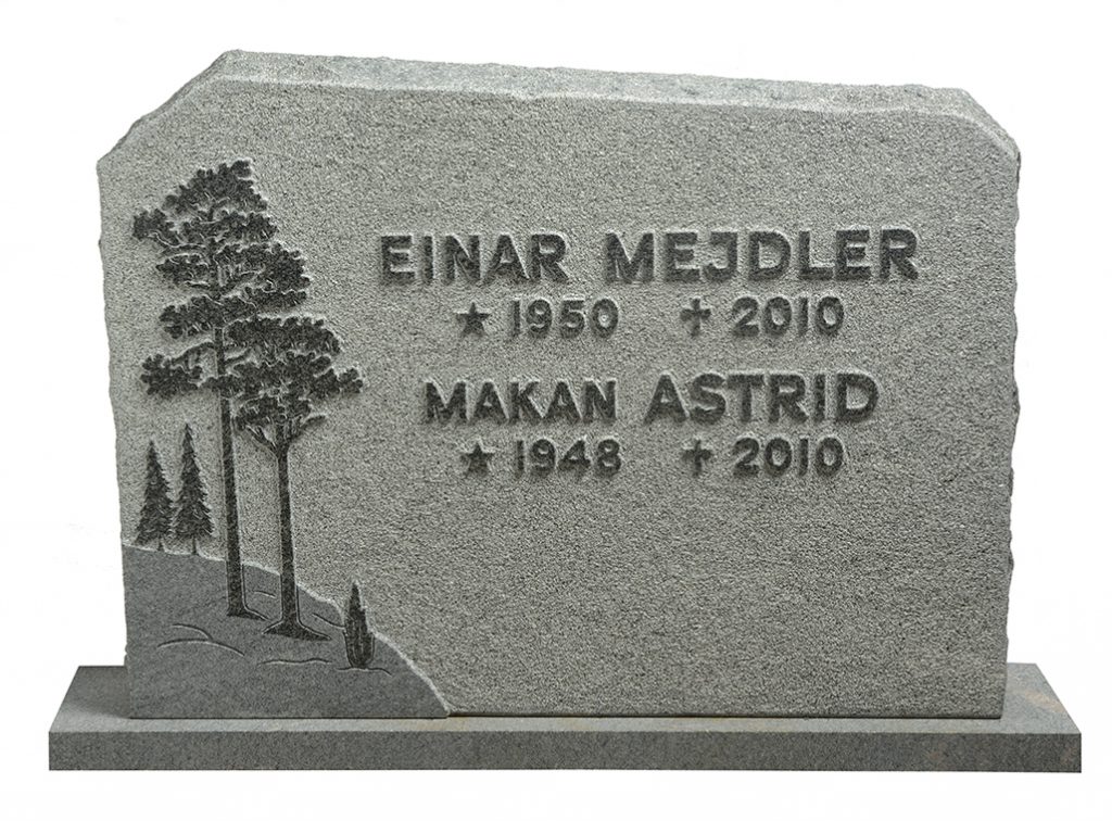 Låg bred gravsten GK1107-C med måtten 65 x 85 cm i mörkgrå granit, finhuggen framsida, råhuggna kanter, stil 41, text och dekor polerad förhöjd.